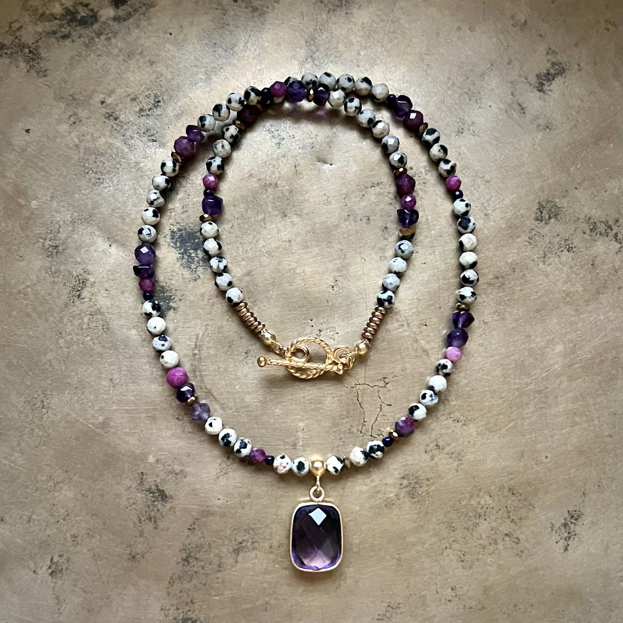 Ręcznie wykonany naszyjnik zachwyca nie tylko pięknem naturalnych kamieni, lecz także ich niepowtarzalnym układem. Głęboka, ziemista barwa jaspisu przeplata się tu z delikatnymi, fioletowymi akcentami ametystu, tworząc kompozycję pełną spokoju i wyrafinowania.