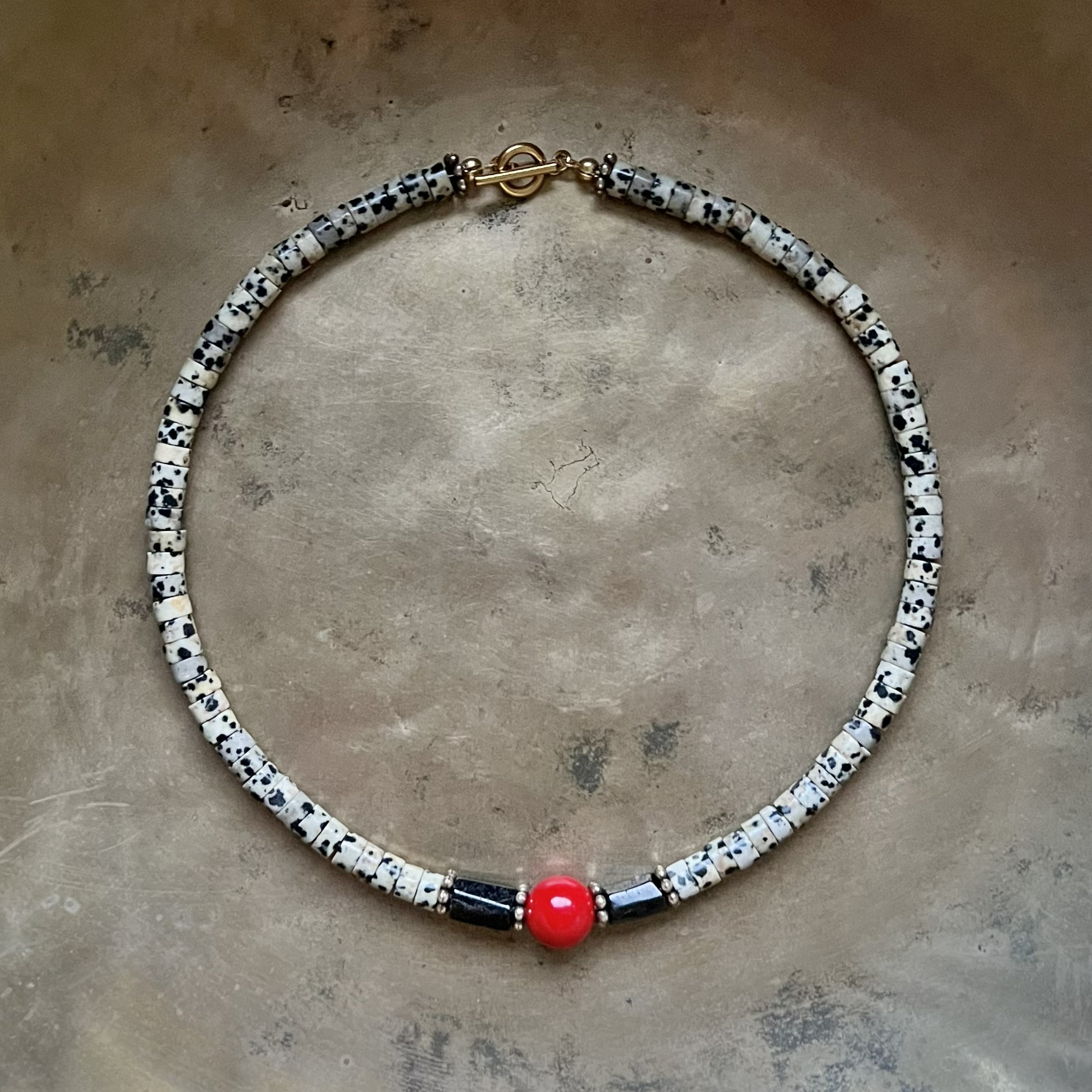 Ten wyjątkowy choker łączy spokojną energię jaspisu z potężną, oczyszczającą mocą czarnego turmalinu, tworząc talizman, który pomaga zachować równowagę w świecie pełnym pośpiechu i bodźców. Jaspis, znany jako „kamień stabilności”, koi emocje i przywraca harmonię, a turmalin działa jak energetyczna tarcza, chroniąc przed negatywnymi wpływami i wzmacniając aurę.