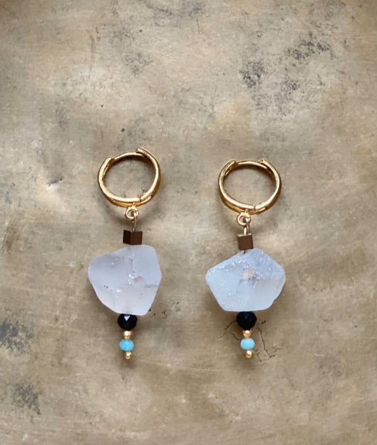Kolczyki to połączenie srebra próby 925 pozłacanego 24 karatowym złotem, z dużym kryształem górskim, czarnym turmalinem, amazonitem i przekładka z hematytu. Wszystko to na bardzo wygodnym zapięciu w formie bigla angielskiego.