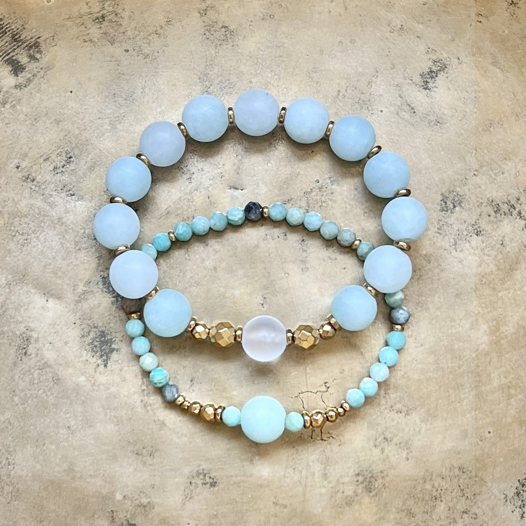 Dodaj swojej stylizacji wyjątkowej energii! 🌿 Zestaw bransoletek z jadeitu i amazonitu to harmonijne połączenie elegancji i naturalnej mocy kamieni. Jadeit przynosi spokój i dobrobyt, a amazonit koi emocje i wspiera wewnętrzną równowagę. Delikatne, pastelowe barwy pasują do każdej stylizacji – od codziennego looku po bardziej eleganckie okazje. To idealny wybór dla kobiet, które cenią piękno z głębszym znaczeniem.