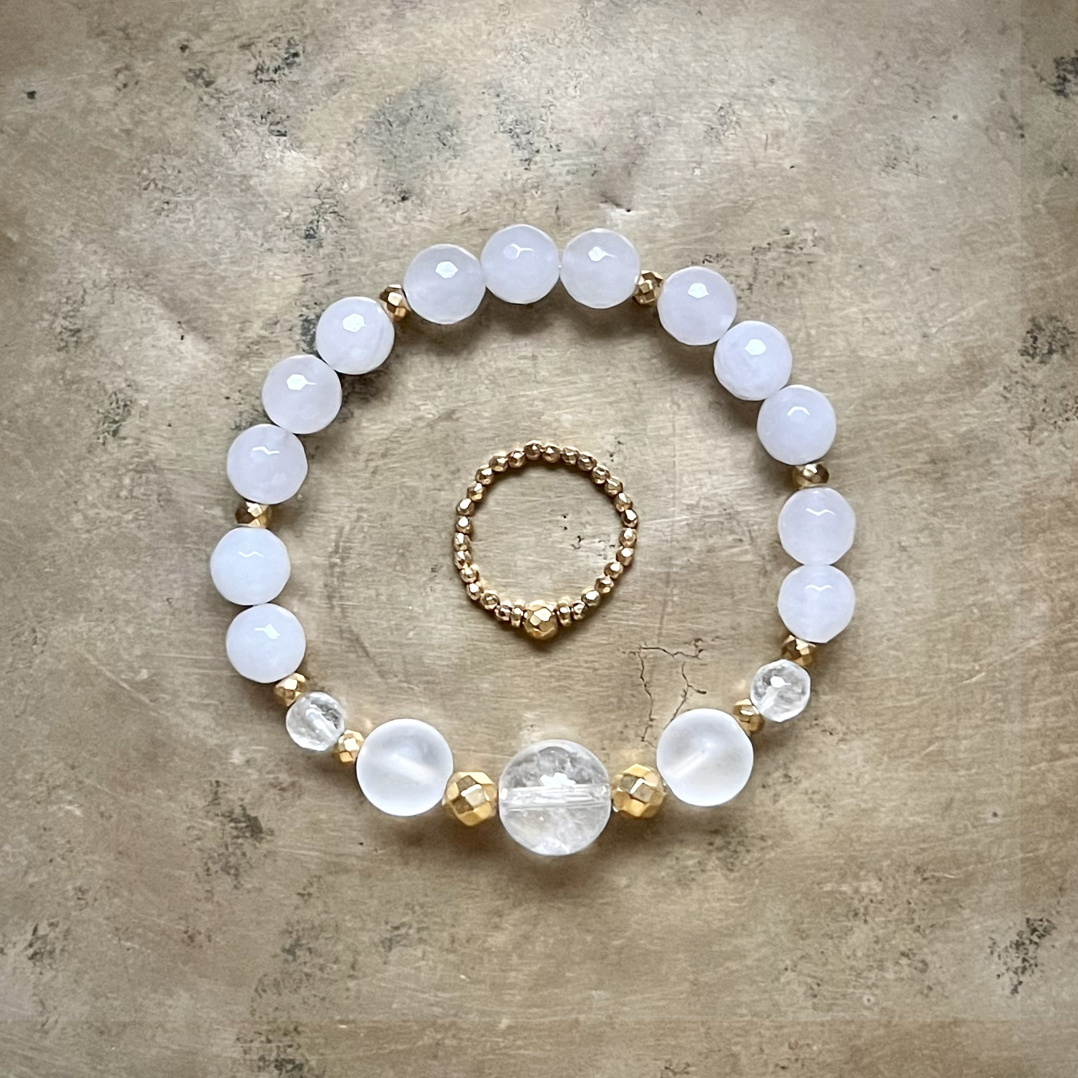 Komplet pełen blasku, elegancki i subtelny zarazem. To więcej niż ozdoba – to osobista przypominajka, że siła, klarowność i spokój są w Tobie. Wyjątkowa bransoletka łączy w sobie moc agatu – kamienia równowagi i wewnętrznego ukojenia – z energią kryształu górskiego, który oczyszcza, rozjaśnia umysł i wzmacnia działanie innych minerałów. Do tego subtelny pierścionek z hematytów w kolorze złotym. Razem tworzą szykowny zestaw.