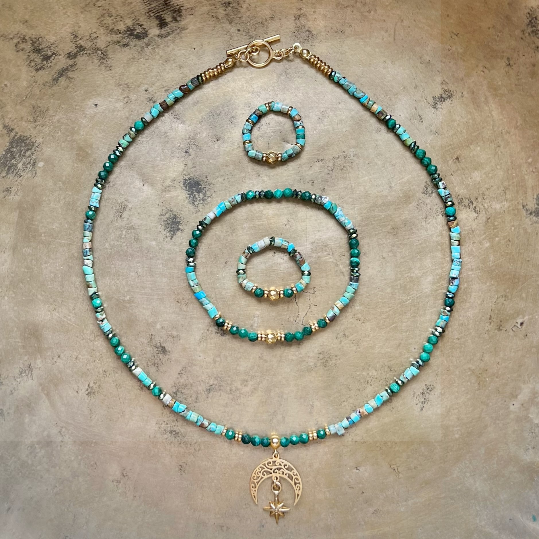 Ten wyjątkowy zestaw – choker, bransoletka i pierścionek – został stworzony z myślą o kobietach, które kochają subtelną elegancję i cenią swoją autentyczność. Zanurz się w zmysłowym świecie, gdzie turkus spotyka malachit, tworząc biżuterię, która łączy romantyzm duszy z nowoczesnym stylem. Minimalistyczna forma, naturalne kamienie i szlachetne detale tworzą kompozycję pełną lekkości, uroku i charakteru. Idealny prezent dla samej siebie albo dla niej. Bo każda historia zasługuje na biżuterię, która ją opowie.